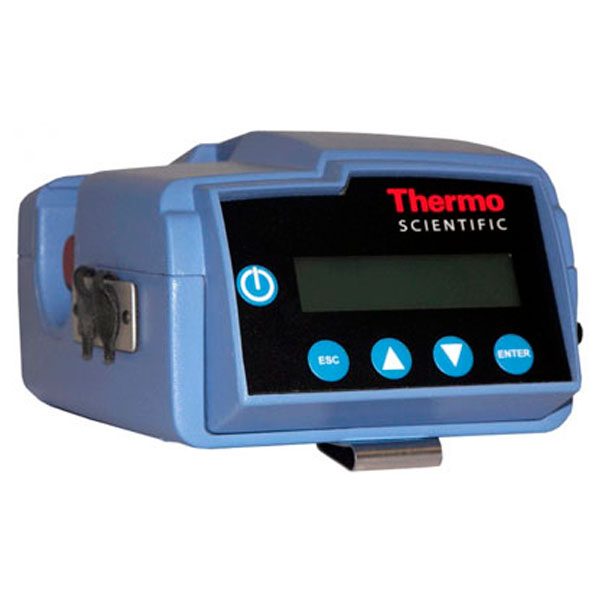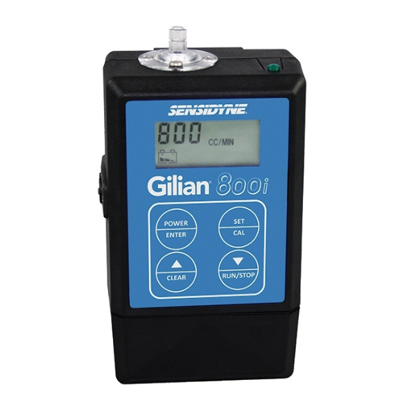 Dispositivo portátil, alimentado por batería, que aspira un volumen conocido de aire directamente de la zona de respiración de un trabajador